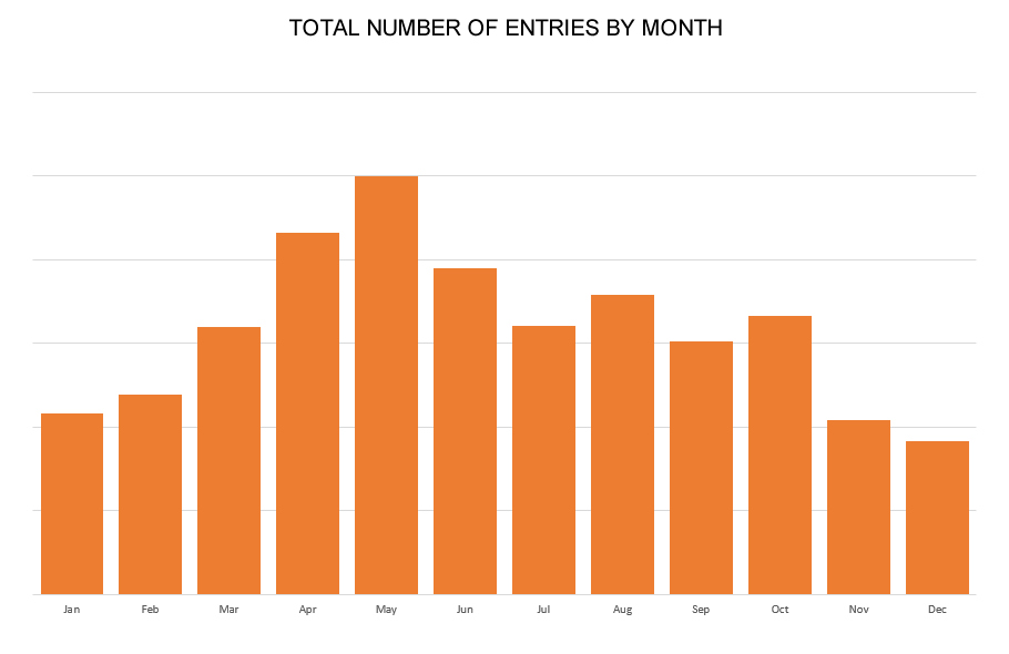 We have included the comparison of month on month really so that it can be used to compare to 2021 (read our 2021 review for more information) where there was a massive peak in March after the lockdown was lifted. In 2022 we can see a more accurate spread of entries over the year, with the May peak due to Summer Shows and One Day events with the quietest month being December (although that may have not been the case without the severe frost we had!)