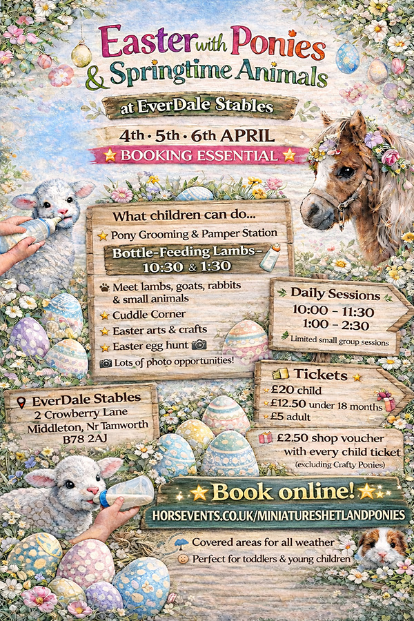 Come and enjoy a hands-on Easter pony & animal experience for children of all ages, with plenty of gentle interactions perfect for toddlers and young children too.