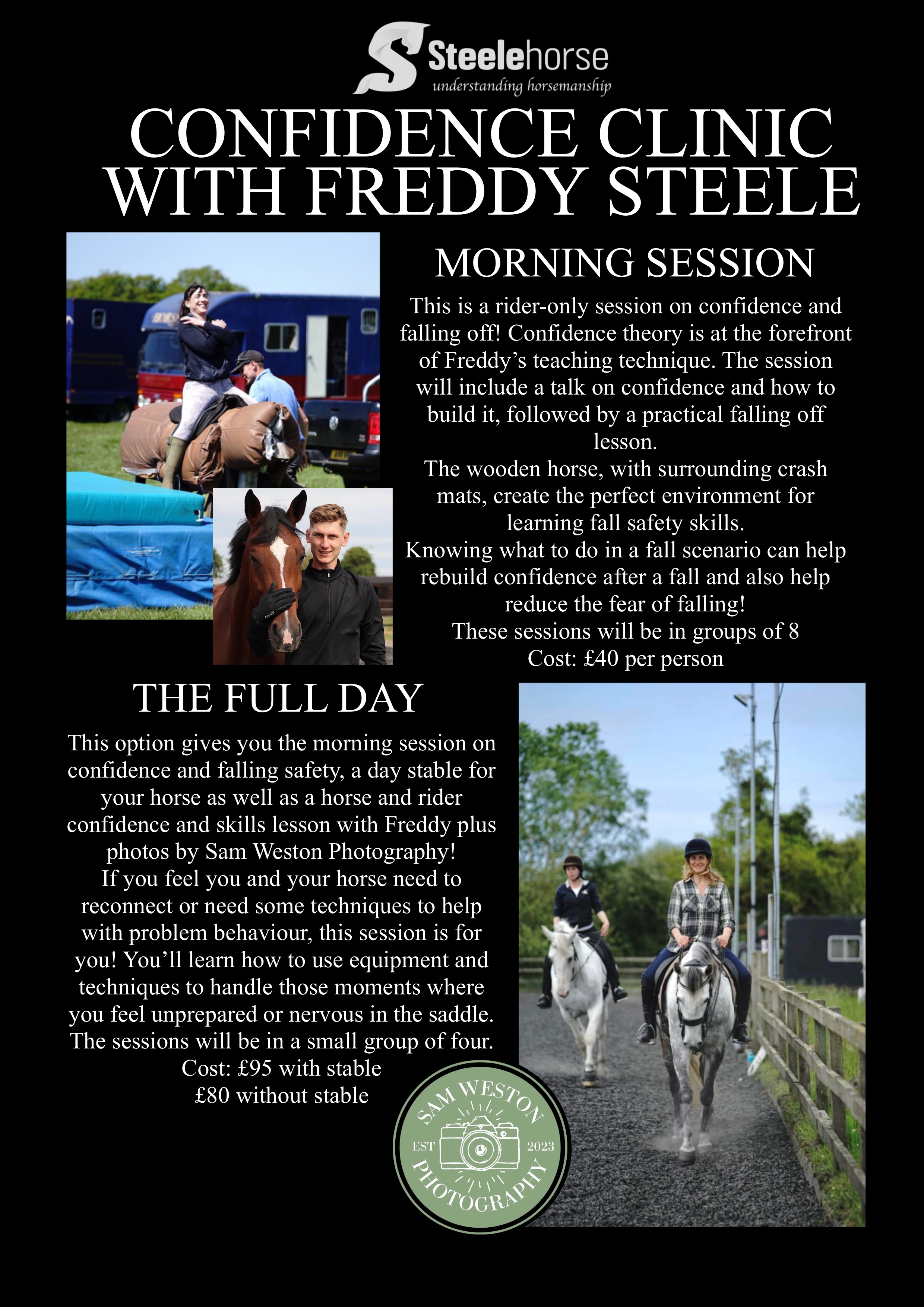 FULL DAY SESSION; This option gives you the morning session on confidence and falling safety, a day stable for your horse as well as a horse and rider confidence and skills lesson with Freddy plus photos by Sam Weston Photography!